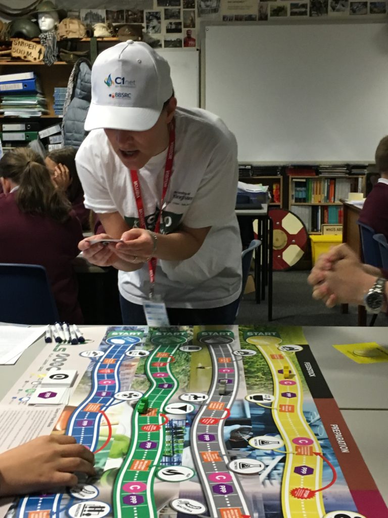 On 27th April 2017, C1net members, Louise Dynes, Jacque Minton, Martina Pasini and Nicole Pearcy, presented ‘Game of Fuels’ to around 50 year 7 pupils at Paulet High School, Burton on Trent, as a fun way of increasing their awareness of biofuels and their importance in meeting future energy demands and combating global climate change. Throughout the game, pupils took on the roles of scientists trying to turn waste materials into their chosen biofuel, whilst being faced with real life political and environmental challenges that either helped or hindered their chances of beating their fellow classmates to the end of the board. Although some of the scientific concepts went beyond their current curriculum, the pupils were enthusiastic and excited to engage in the science whilst playing the game. Out of the 30 completed feedback forms, 100% of pupils reported they enjoyed the game, 90% said they learnt something, and 66% said they would like to learn more about biofuels!